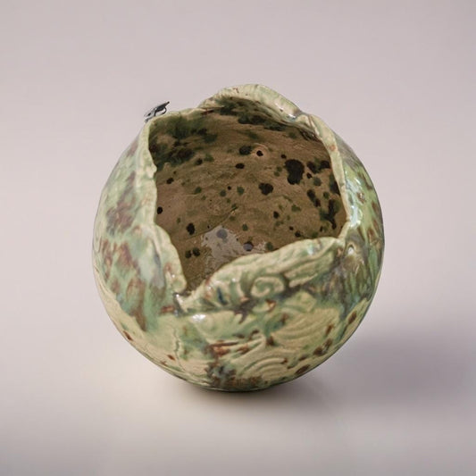 Hatching Sphere Ceramic Planter – Woodland Leaf-Touched Shell, Ø11×11 cm
