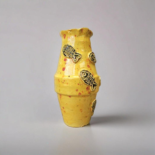 Sunburst Ceramic Vase – Ochre Glazed Fishbone Vessel, Ø9×17 cm