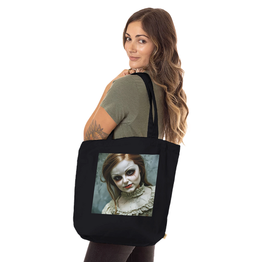 Creepy Doll Eco-Cotton Tote – Eerie Smile for Phantom Hearts, 10 L / in 2 colors