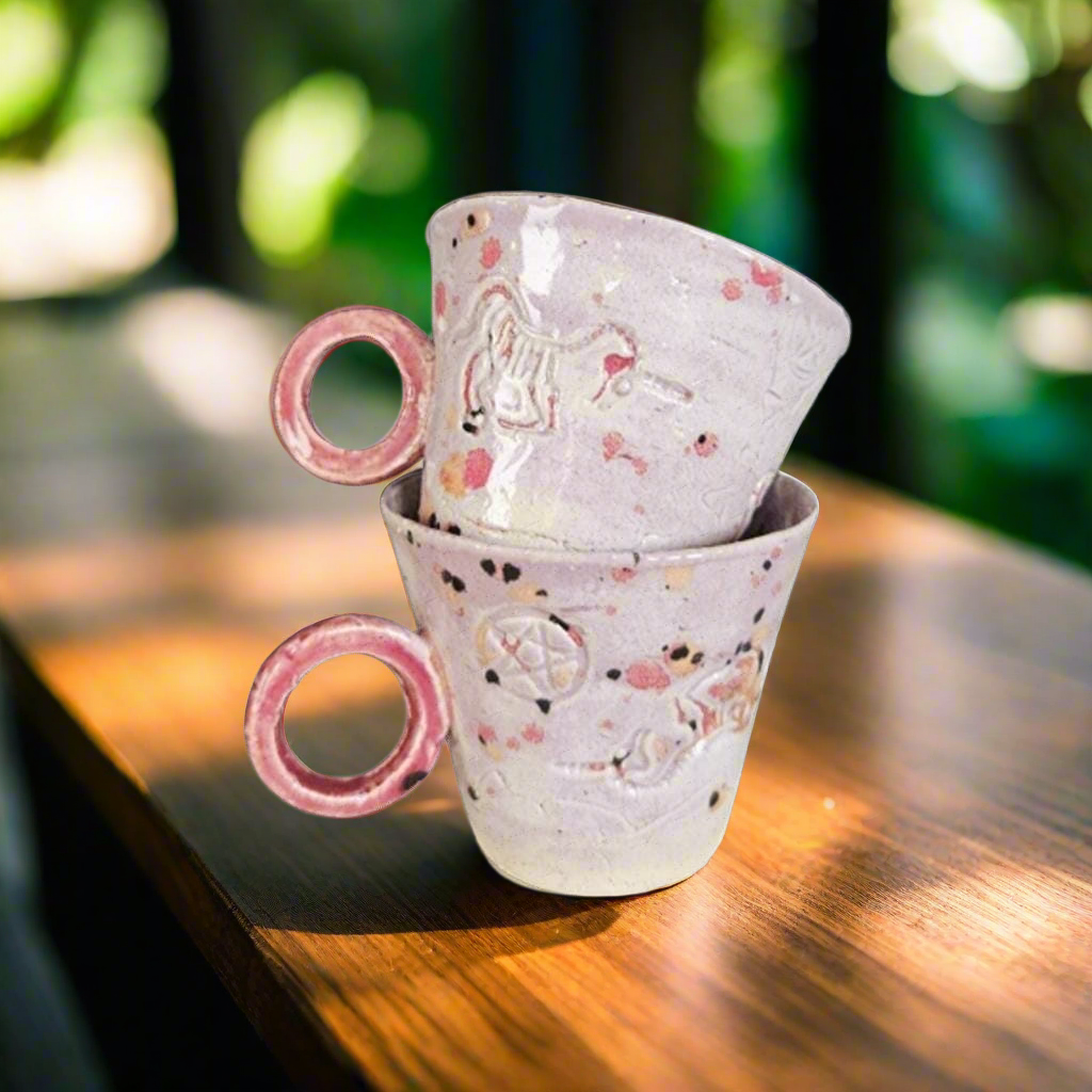 A playful darkness cloaked in sugar-pink glaze - this duo of tiny espresso cups or demitasses brings together skeletal unicorns, pentagrams, and a taste for ritual whimsy. Designed for those who flirt with the occult and delight in the unexpected, each mini vessel conjures a story of forbidden sweetness. Perfect for serving strong coffee, wicked brews, or simply adorning your altar of the everyday.