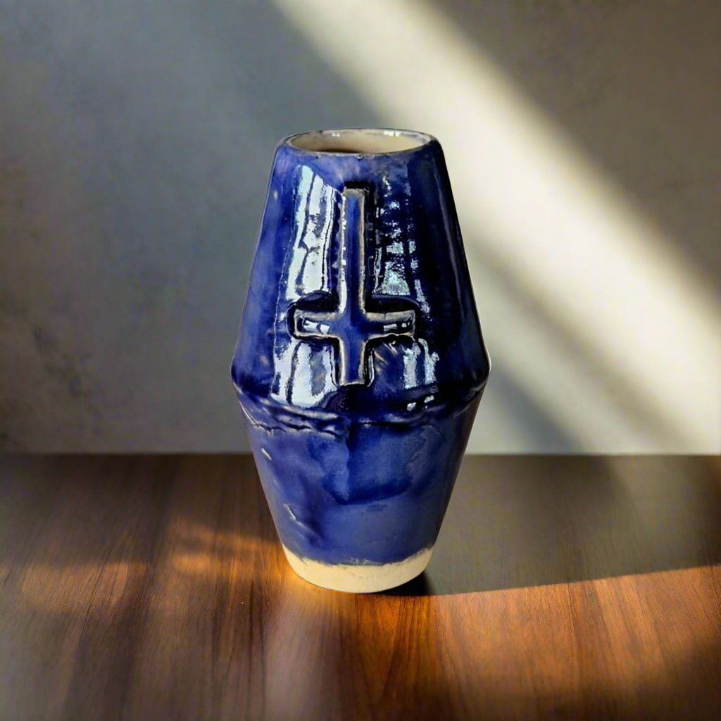 A vessel for the defiant sacred. This mini vase bears the mark of the inverted cross - not loud, but etched with intent into deep, dark glaze. A handmade form for altar spaces, shelf rituals, or small dried stems. Bold in meaning, subtle in scale, and quietly symbolic. For those who find presence in subversion, and beauty in the shadows.